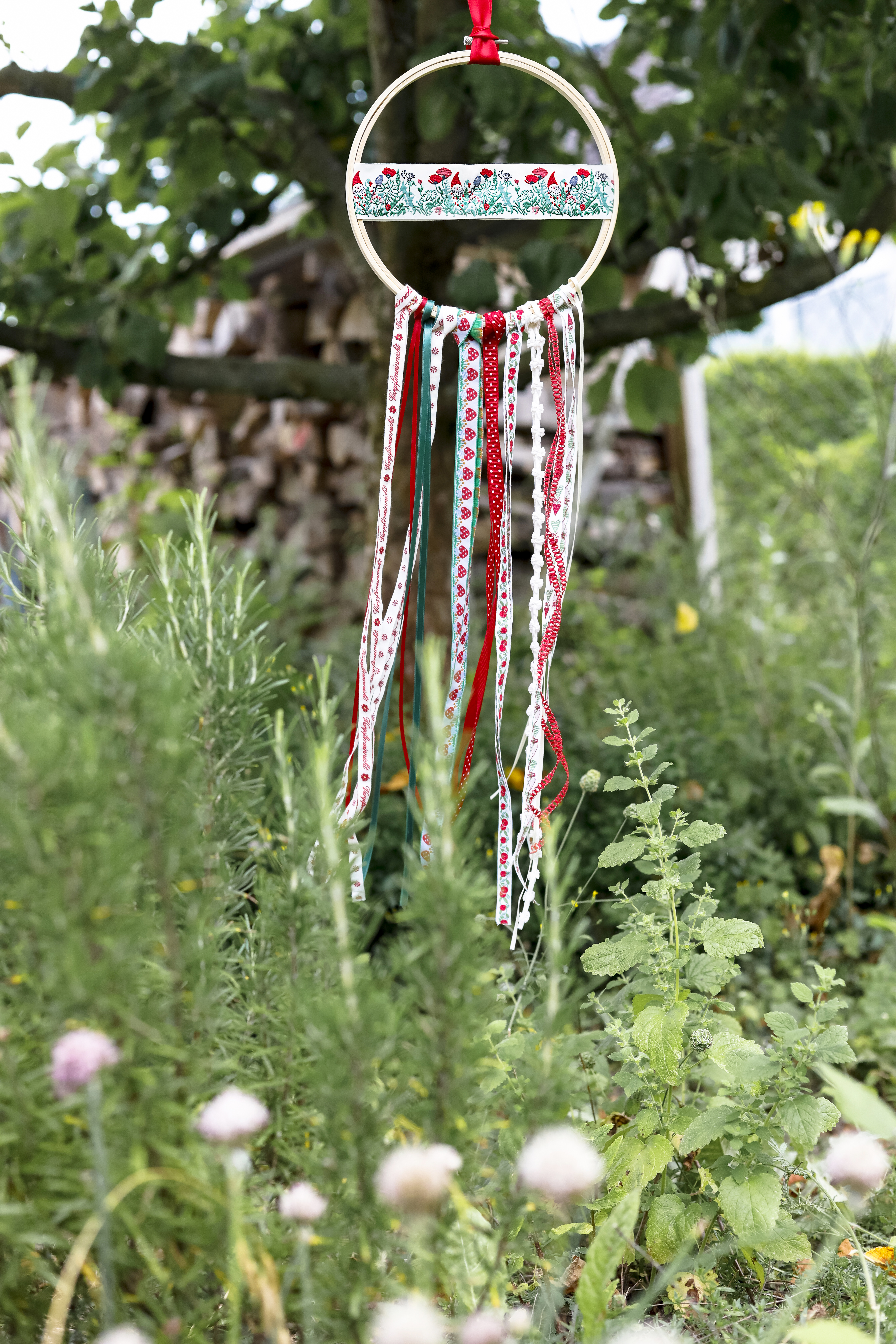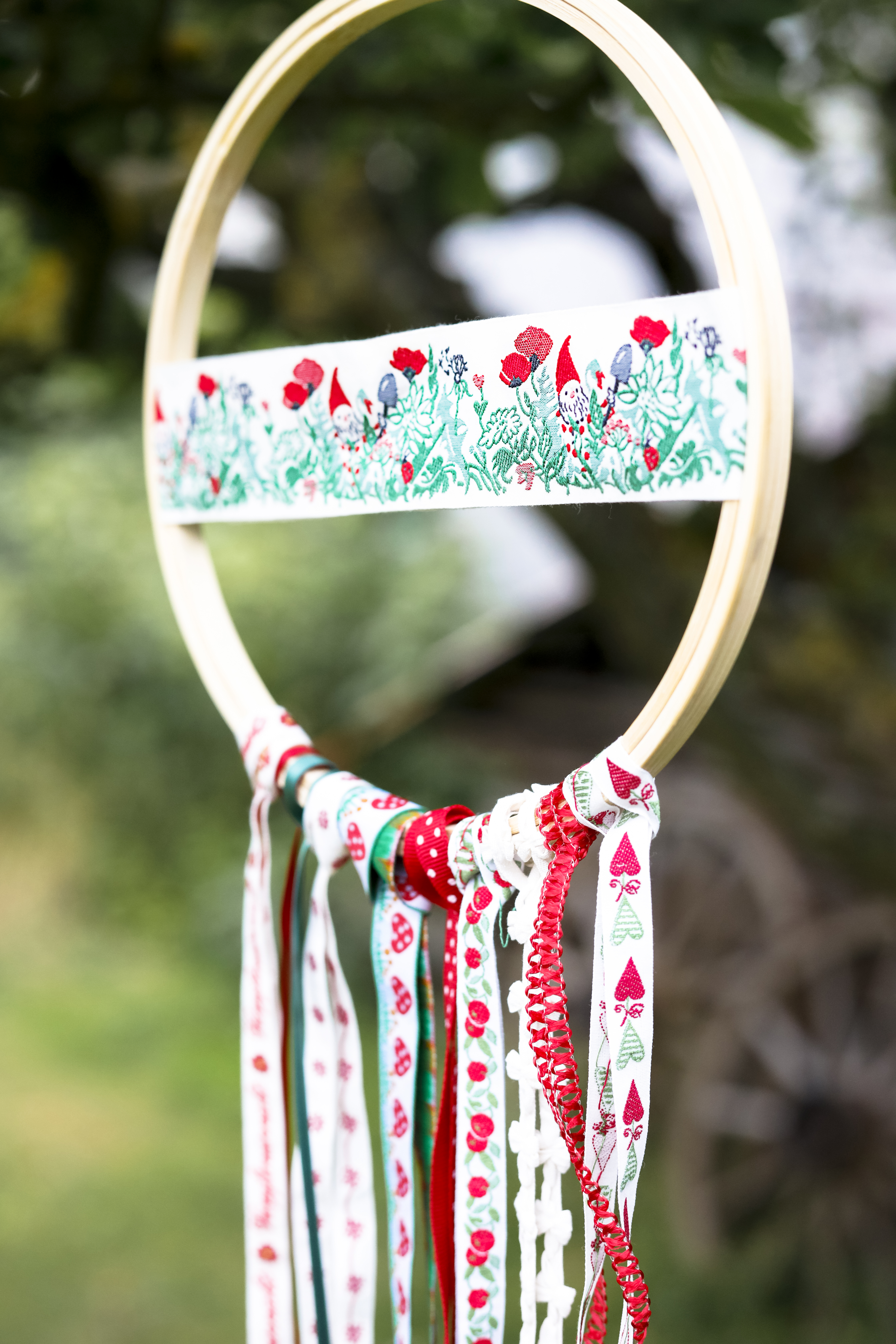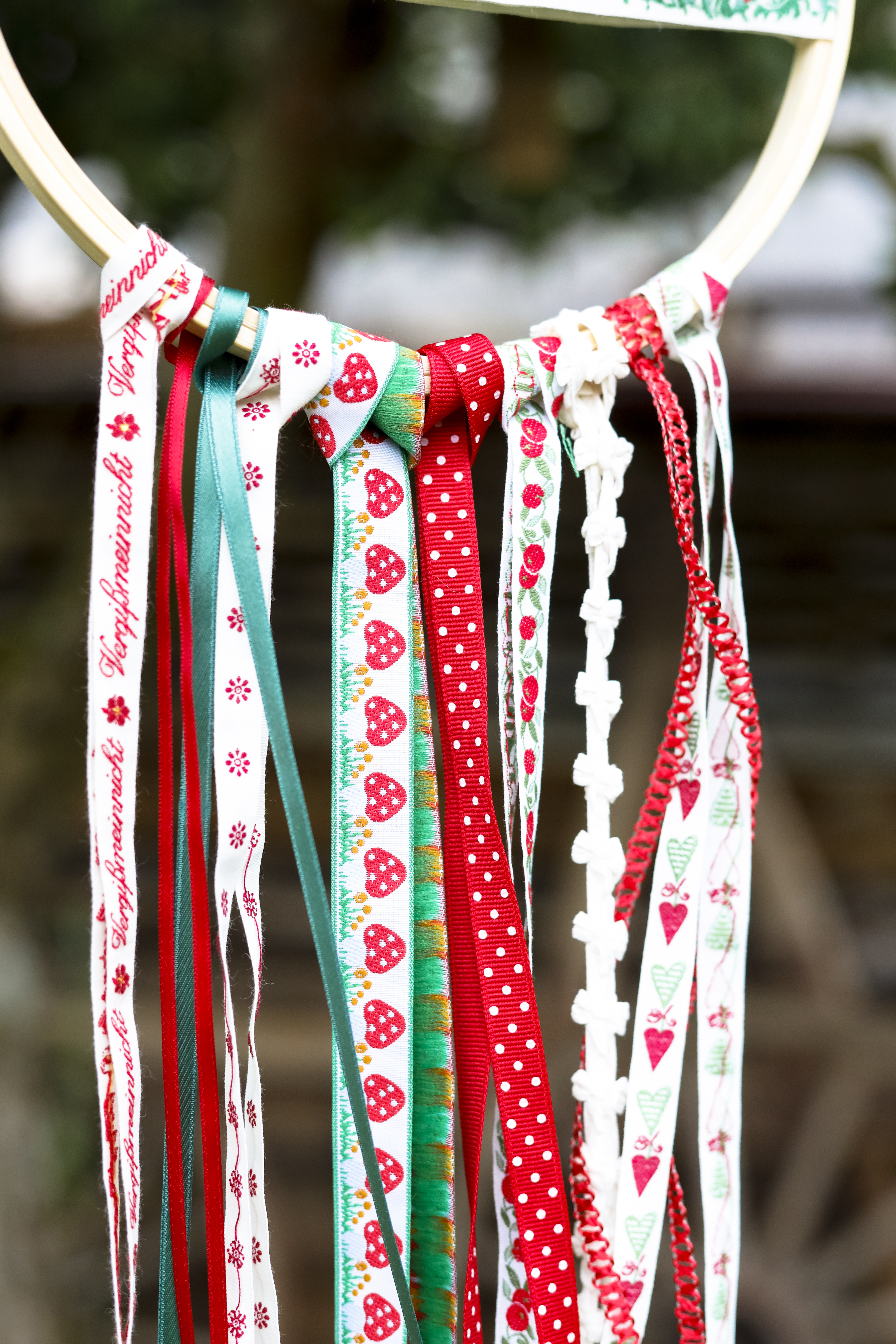 Zwergenwiese - Schmuckwebbänder in einem zauberhaften Mix in Rot-Grün. Die Bänder stammen aus dem Hause Acufactum und aus der Bänderei Kafka.