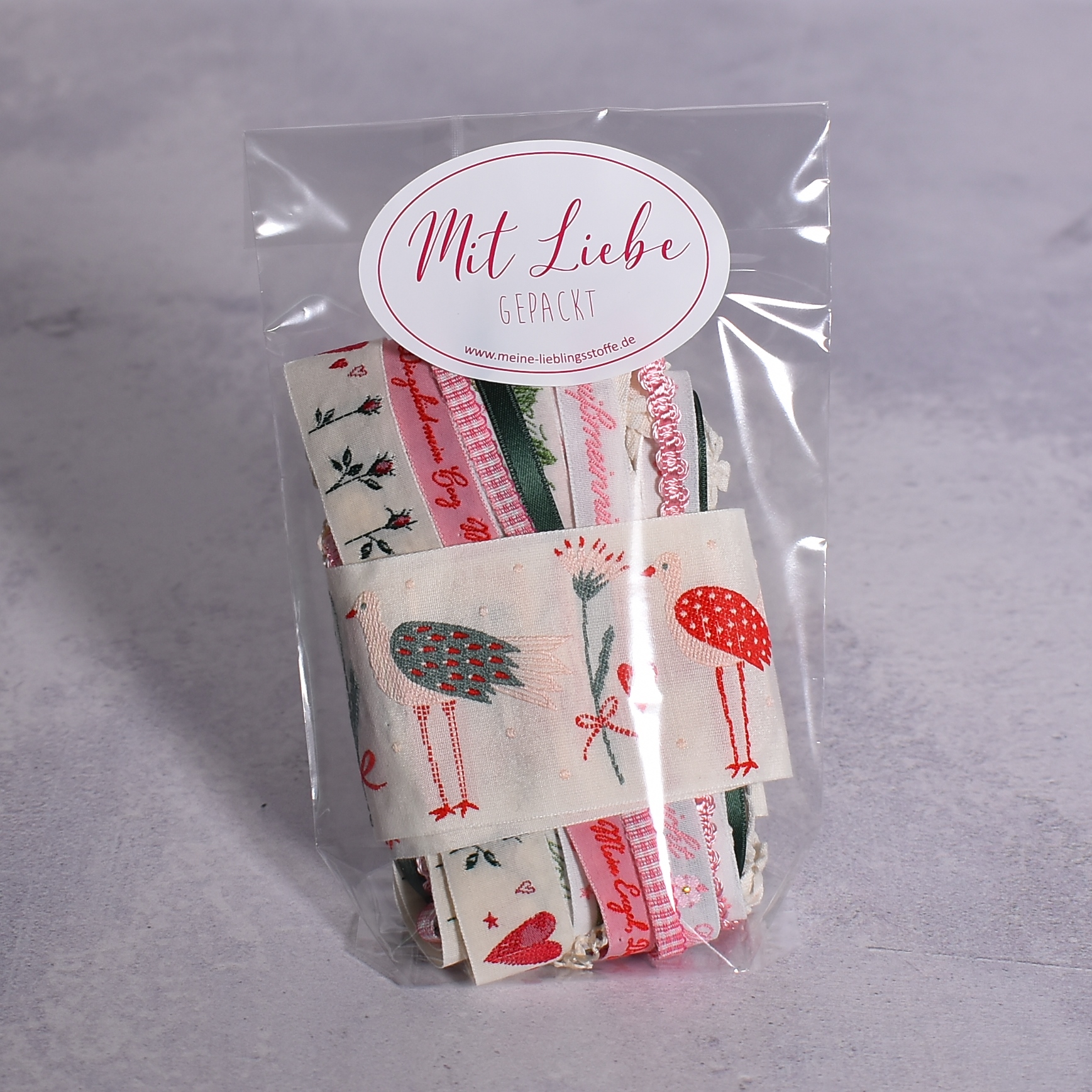 Dieses Bänderpaket enthält einen liebevoll und farblich zusammengstellten Mix aus insgesamt 11 Webbändern, Spitzen und Satinbänder. Die Zusammenstellung der Bänder kann leicht varieren.