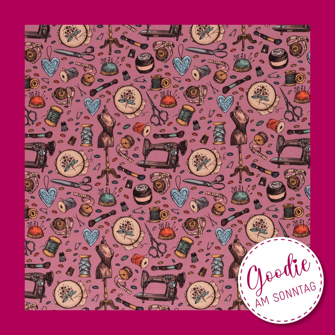 Bis Sonntag 09.11.2025 bis 23:59 Uhr gibt es zu jeder Bestellung ab 40,00 € Warenwert 0,50 x 1,40 m von diesem schönen Baumwollstoff mit den vielen Näh- und Handarbeitsutensilien gratis dazu.