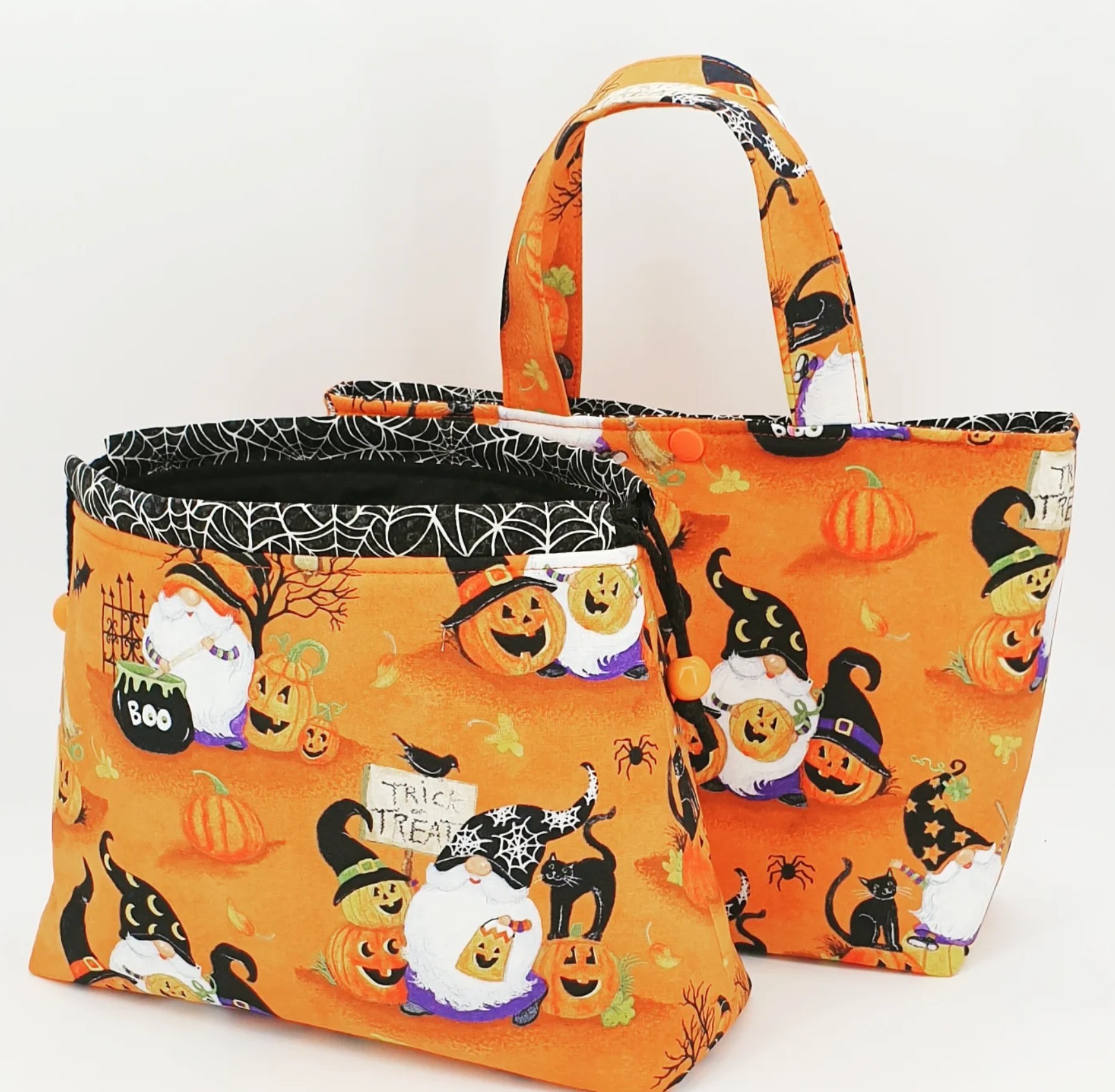 Patchworkstoff mit vielen Wichteln, Kürbissen, Katzen und Fledermäusen auf Orange aus der Serie "The Boo Crew"