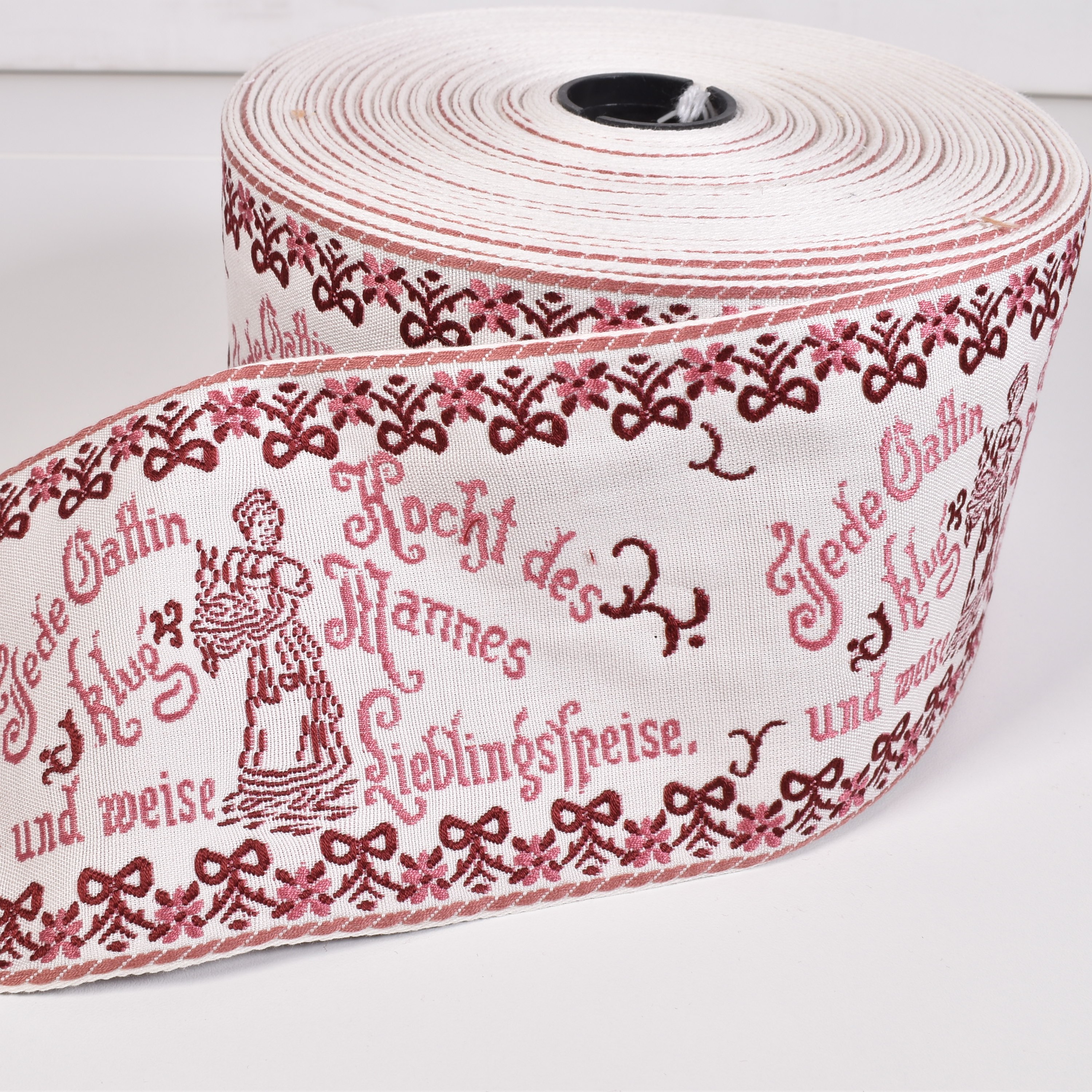 Nostalgisches Webband mit dem Küchenspruch in Rot, gewebt in der ehemaligen Bandweberei Vaupel und Heilenbeck.