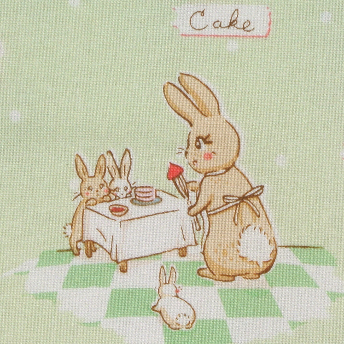 Die süßen kleinen Hasen backen mit ihrer Mutter leckere Plätzchen. Süßer Patchworkstoff mit kleinen Hasen auf Hellgrün aus der Serie "Bunnies and Cream".