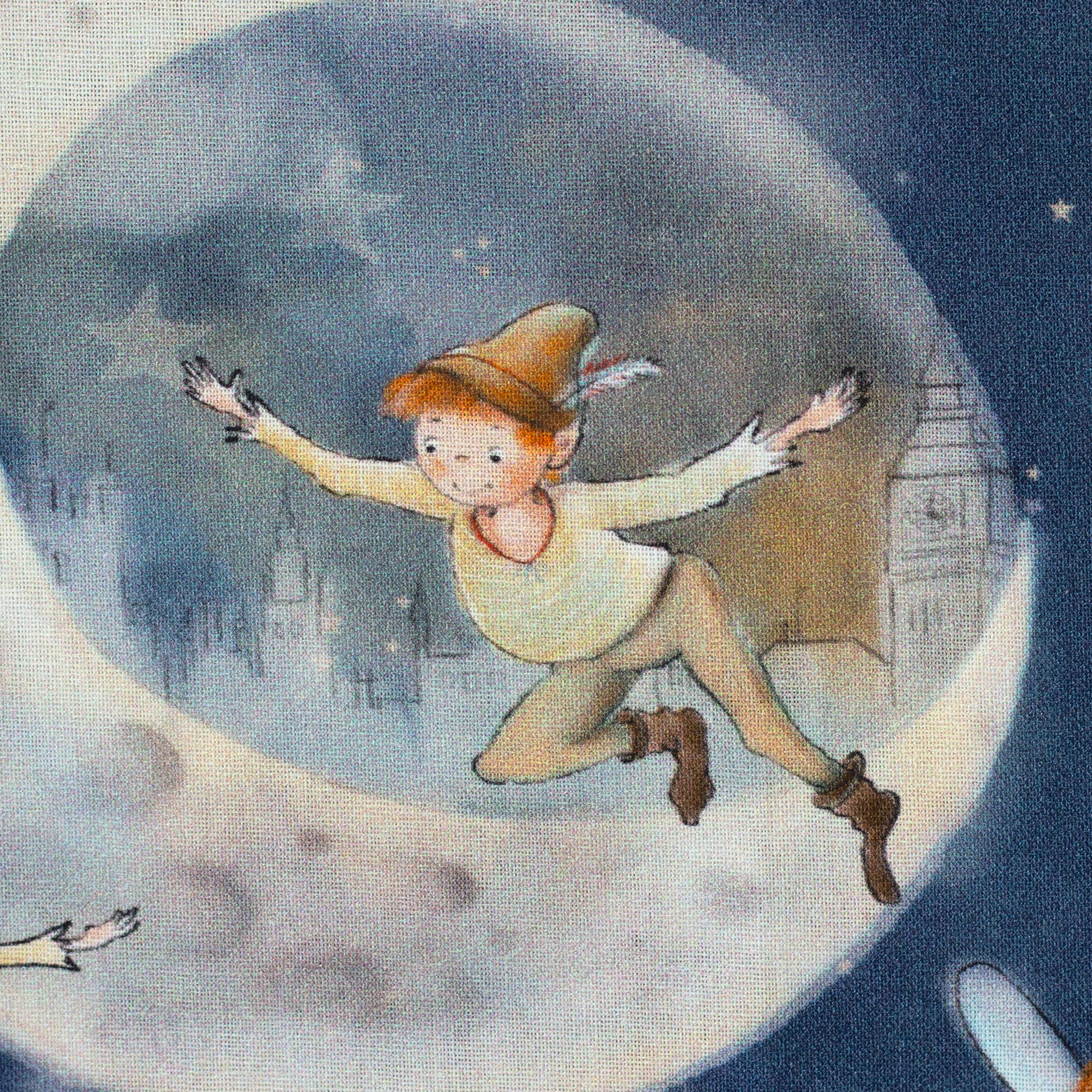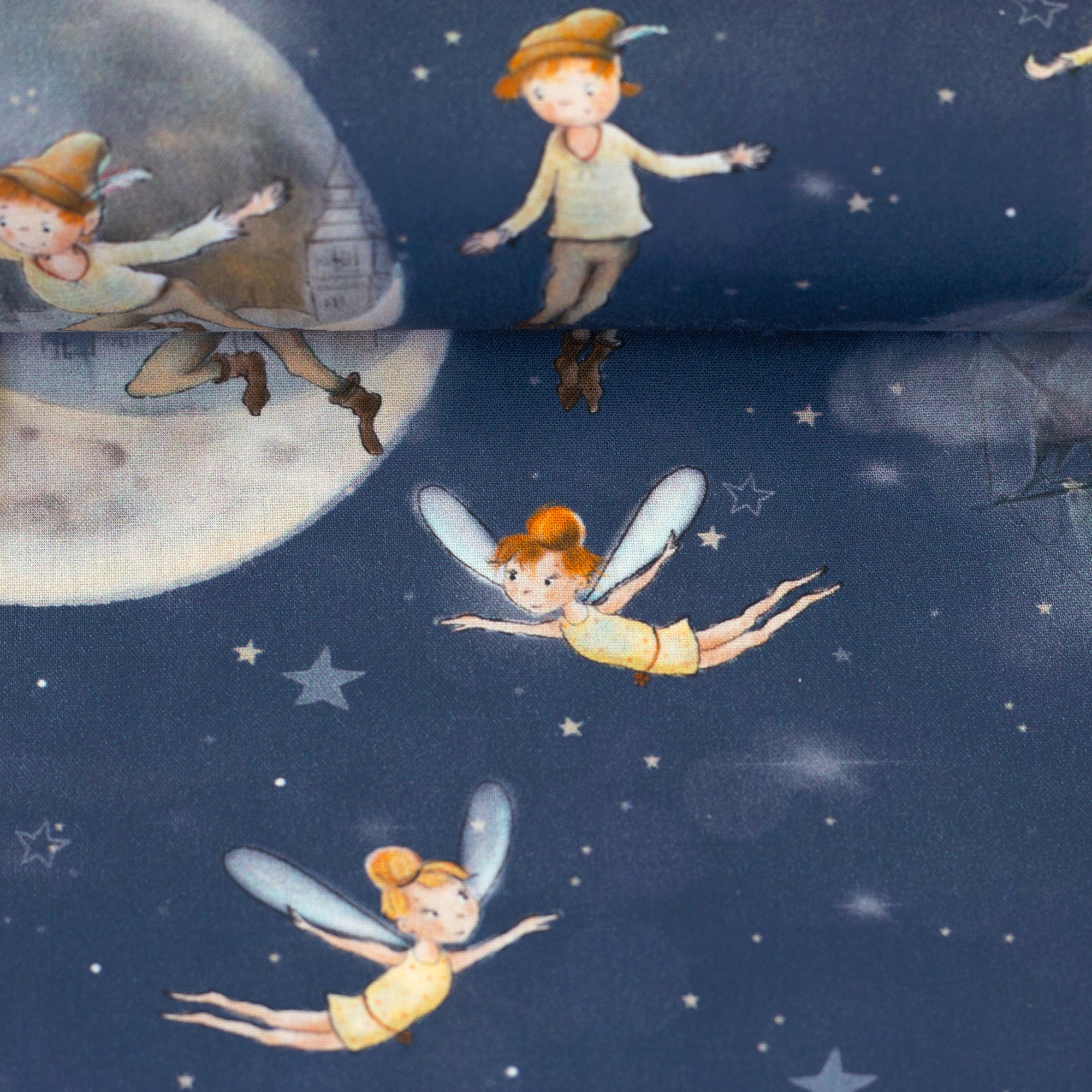 Bedruckter Baumwollstoff mit zauberhaften, magischen Motiven auf Blau mit kleinen Elfen am Nachthimmel aus der Serie "Fairy Tale" aus dem Hause Swafing.