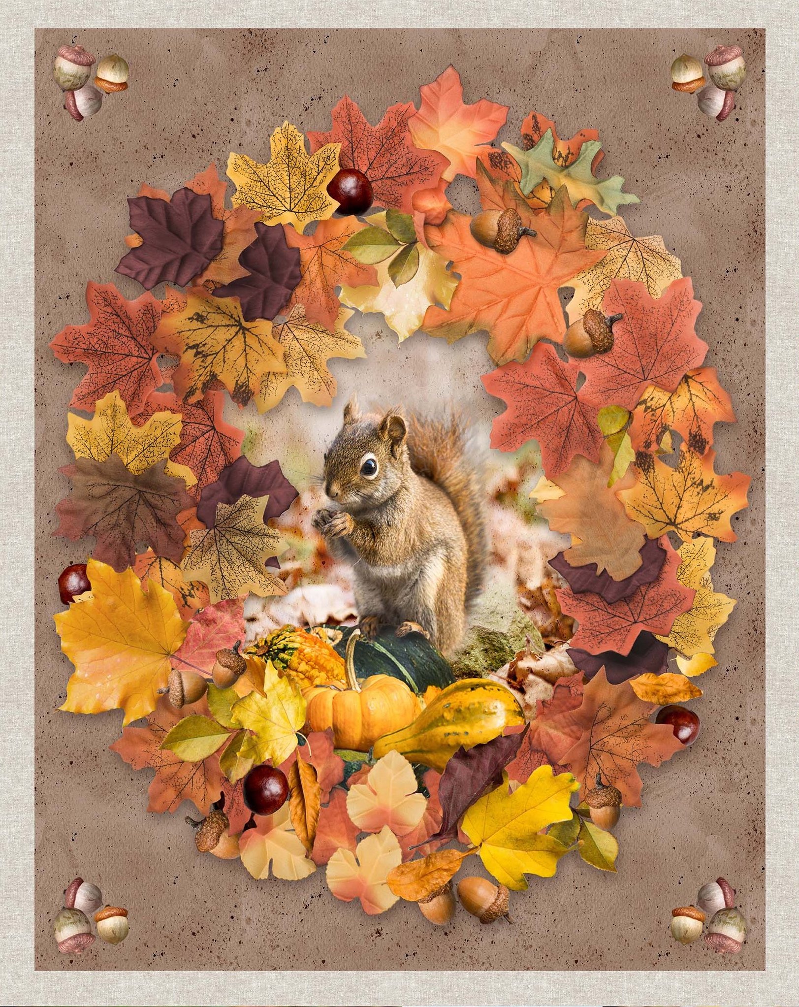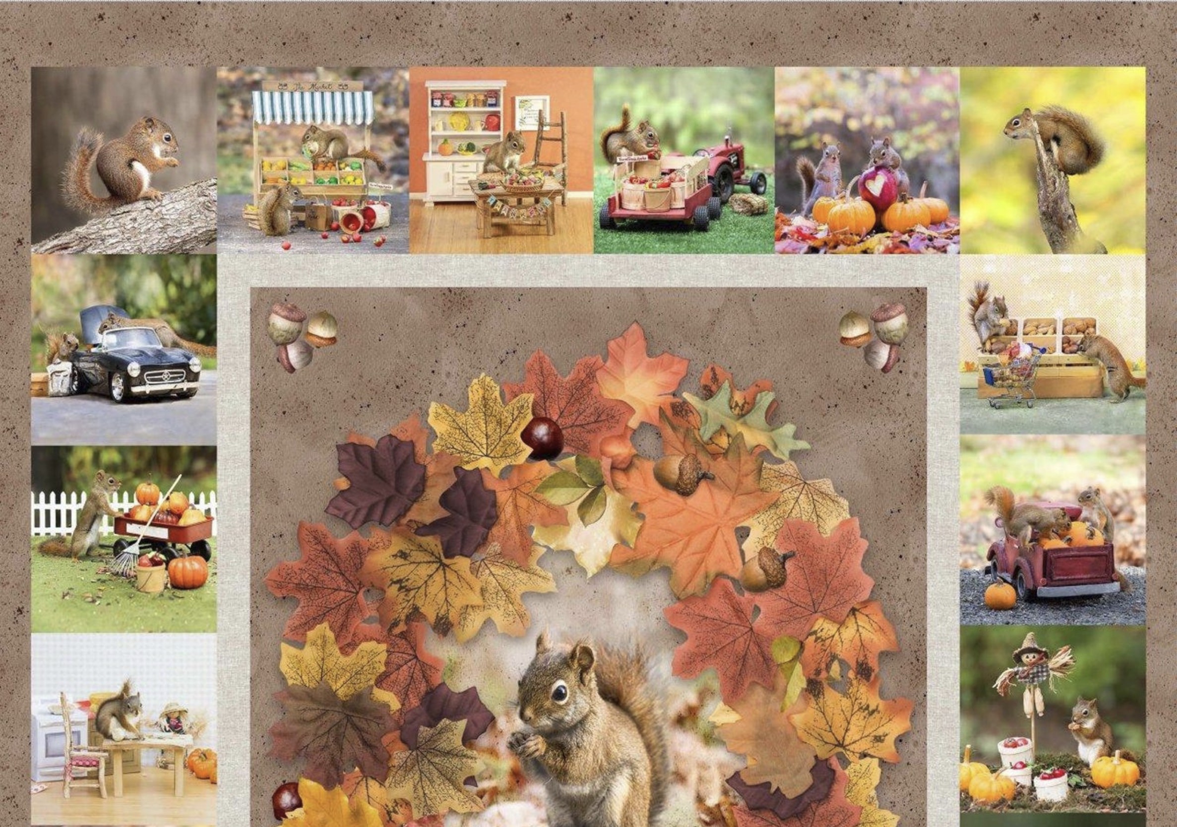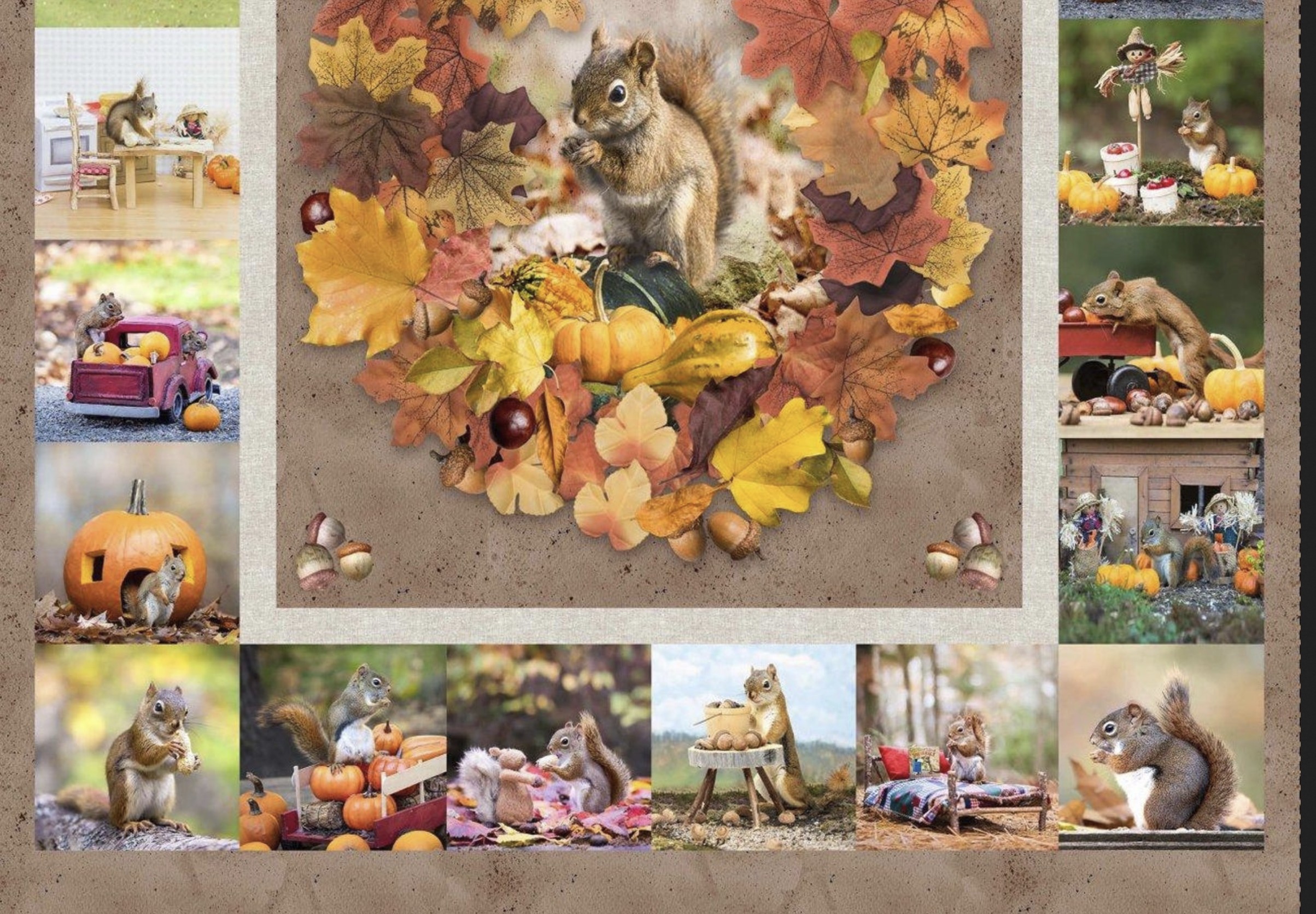 Großes herbstliches Patchworkstoff Panel mit vielen kleinen, unternehmungslustigen Eichhörnchen Bilder. Ein ausgefallener Webware-Baumwollstoff von Clothworks.