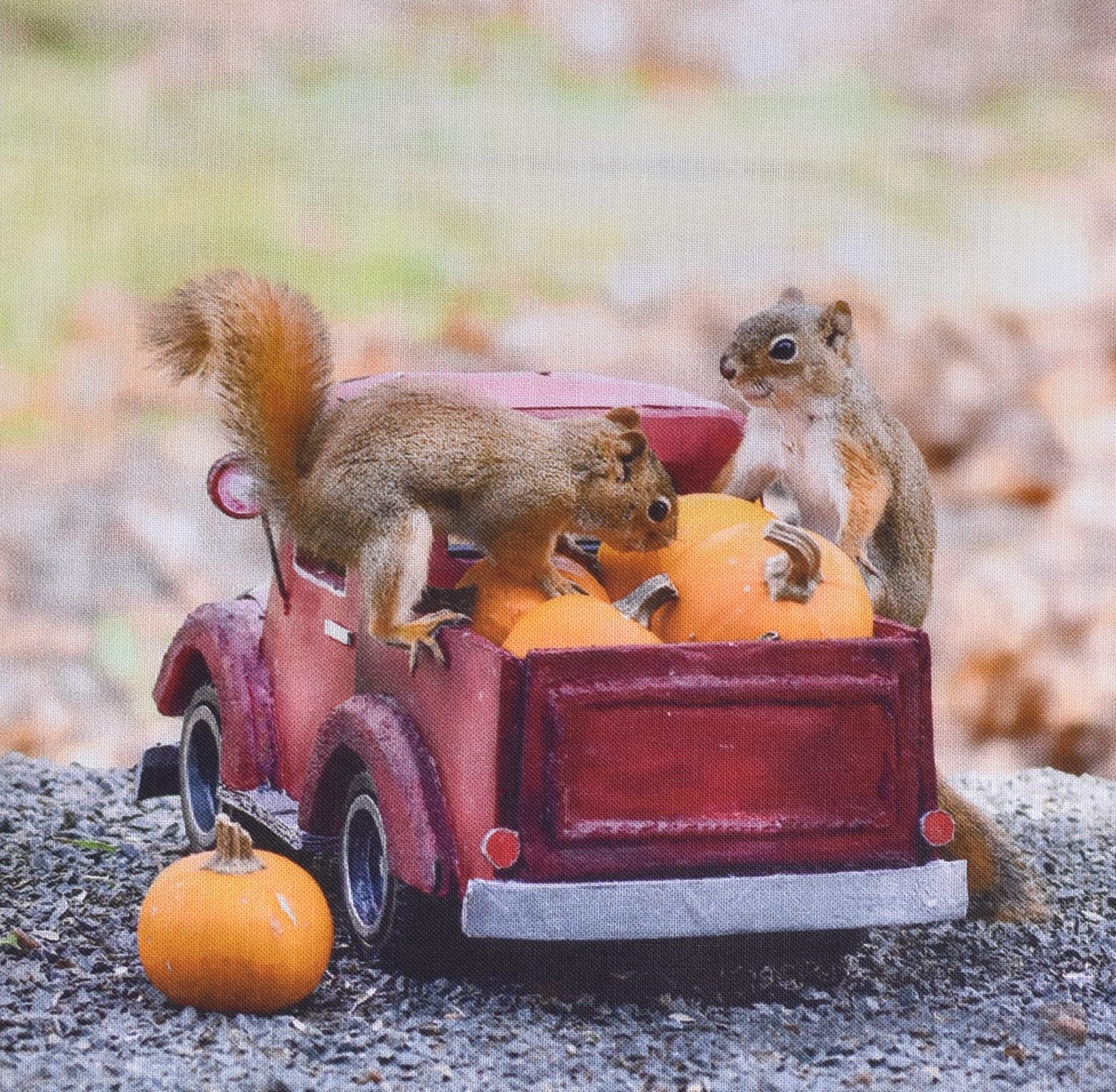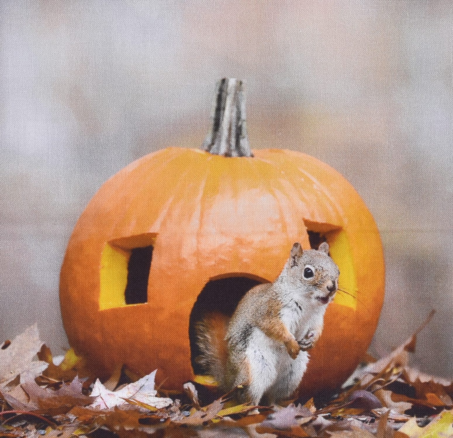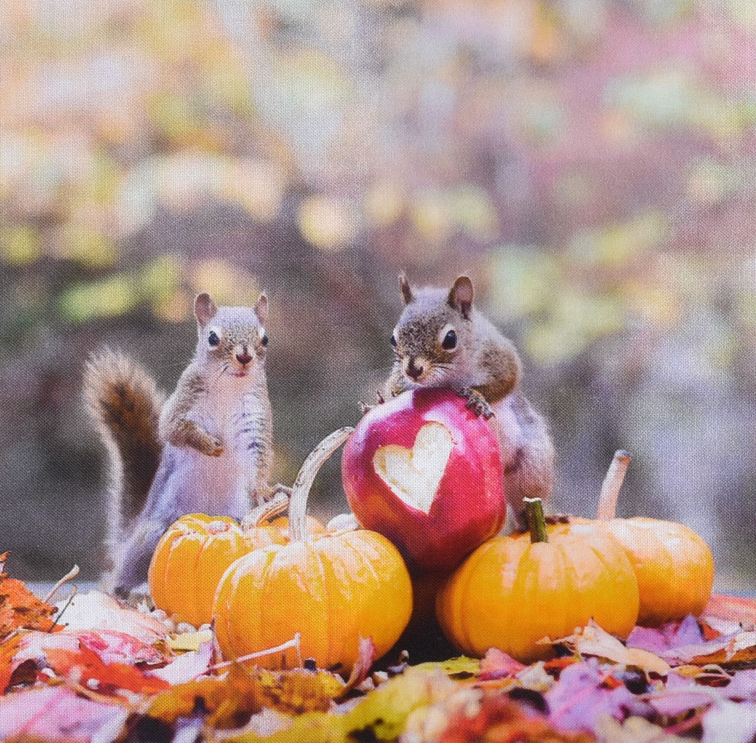 Großes herbstliches Patchworkstoff Panel mit vielen kleinen, unternehmungslustigen Eichhörnchen Bilder. Ein ausgefallener Webware-Baumwollstoff von Clothworks.
