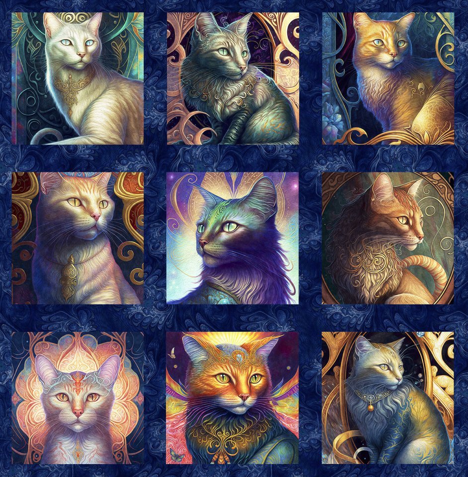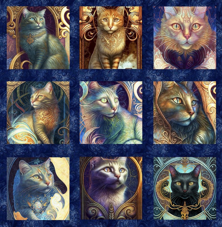 Großes Patchworkstoff Panel mit fantasievollen edlen Katzen aus der Serie "Feline Fantasia".