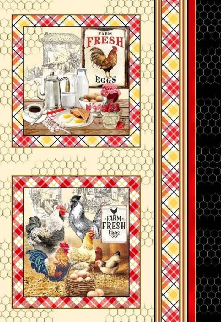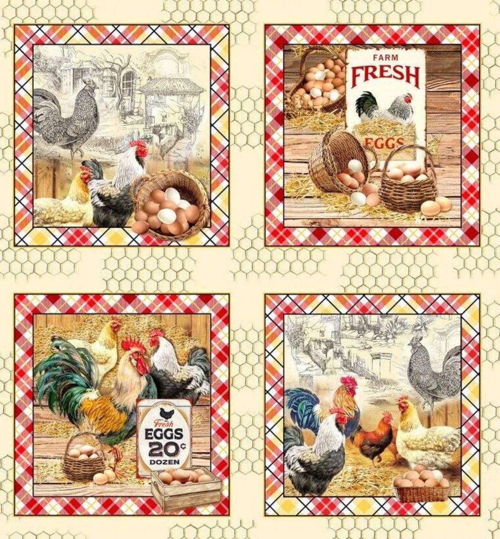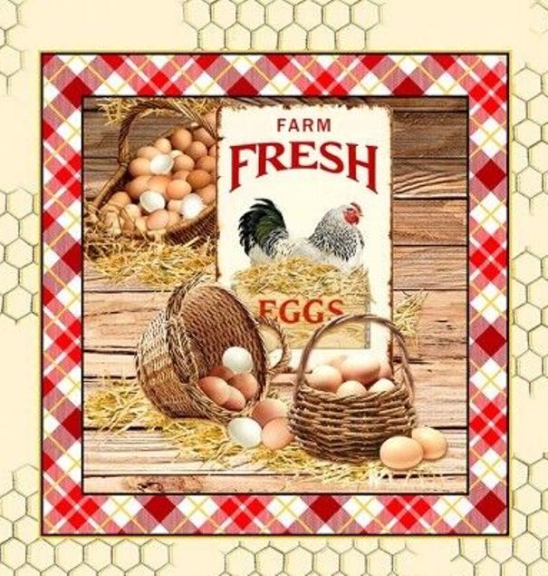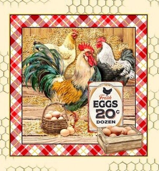 Patchworkstoff Panel im Vintage-Stil mit Hühnern, stolzen Hähnen und vielen frischen Eiern aus der Serie "Early to Rise".
