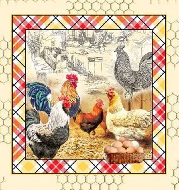 Patchworkstoff Panel mit Hühnern und stolzen Hähnen aus der Serie "Early to Rise".
