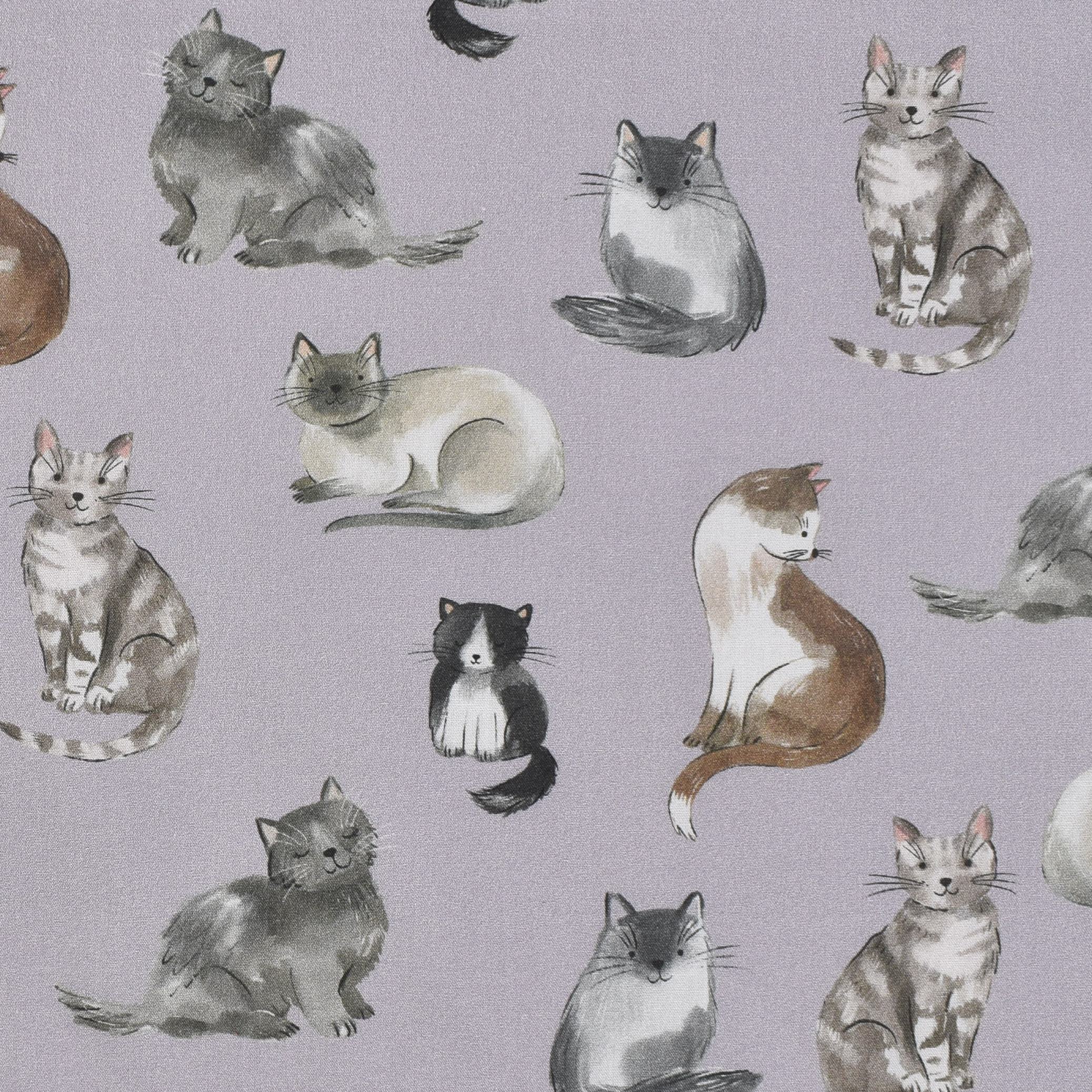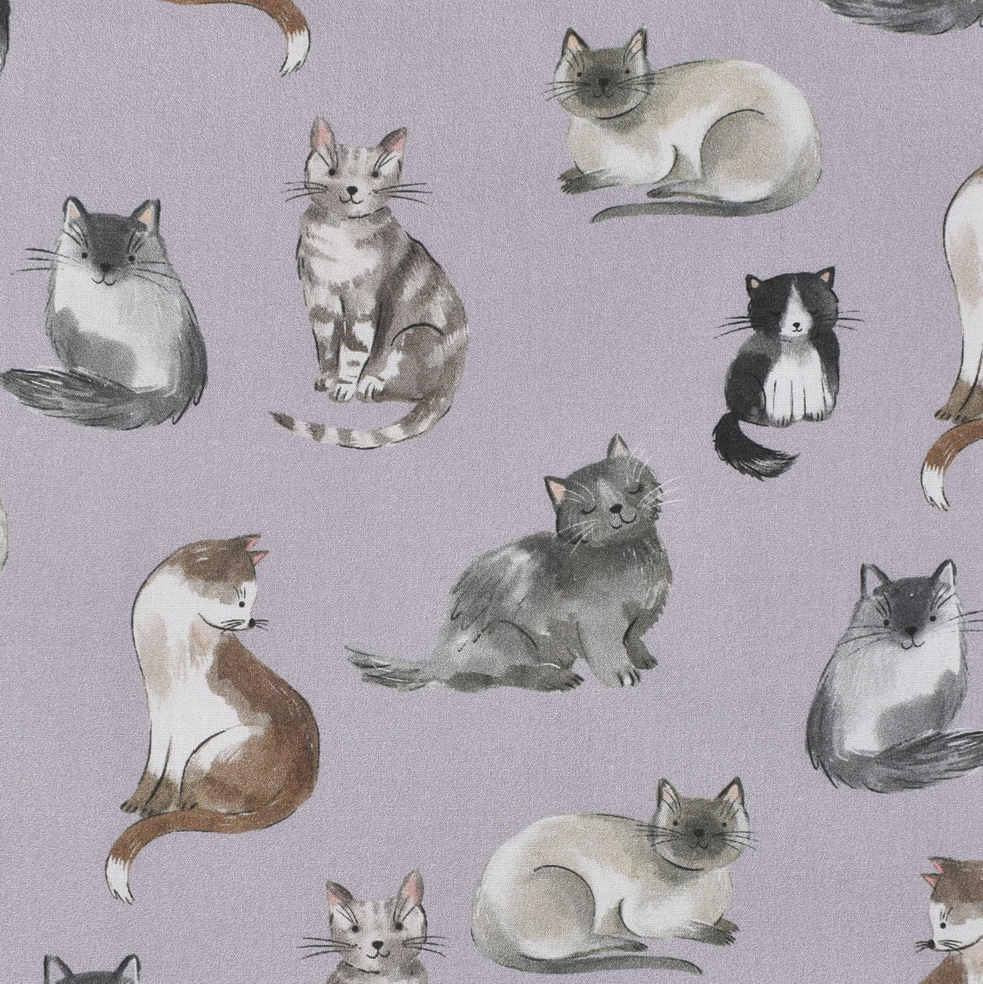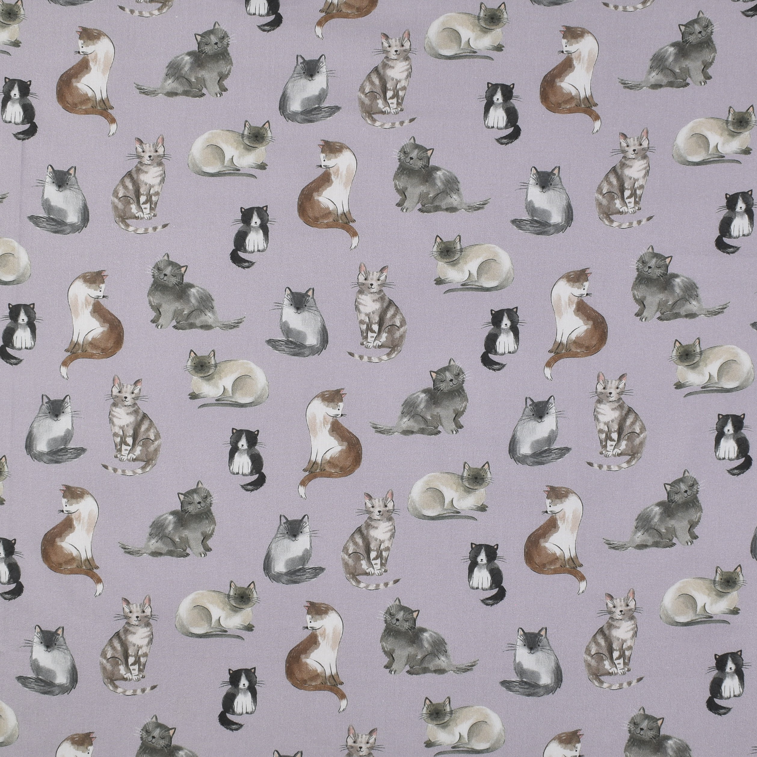 Popeline Baumwollstoff mit vielen Katzen, Rassekatzen und Kätzchen auf Hellgrau