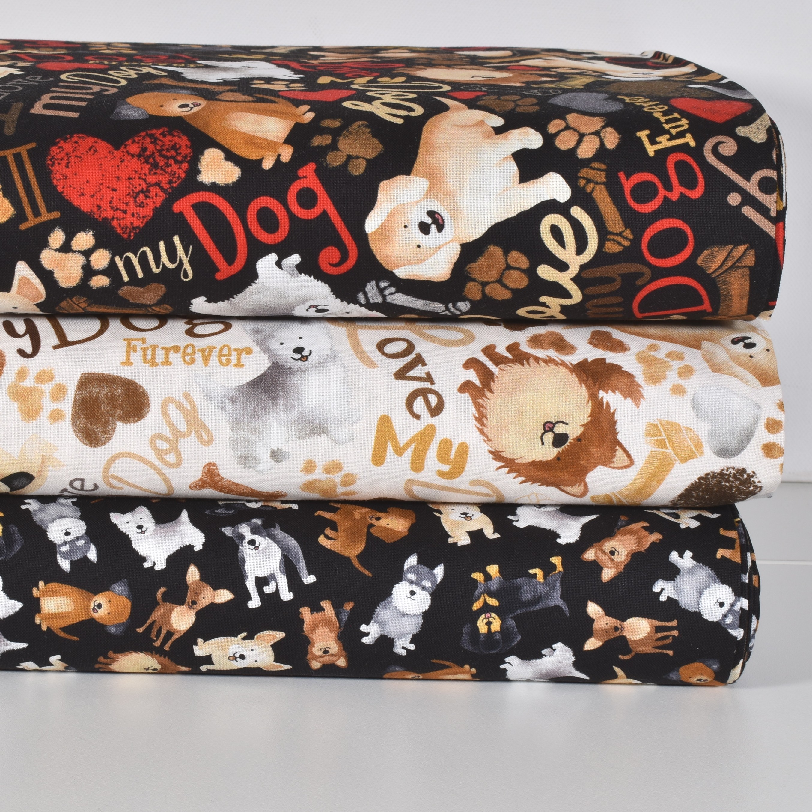 Ein ausgefallener Webware Baumwollstoff für Hundefreundinnen aus der Serie "Happiness has Paws" von Timeless Treasures.