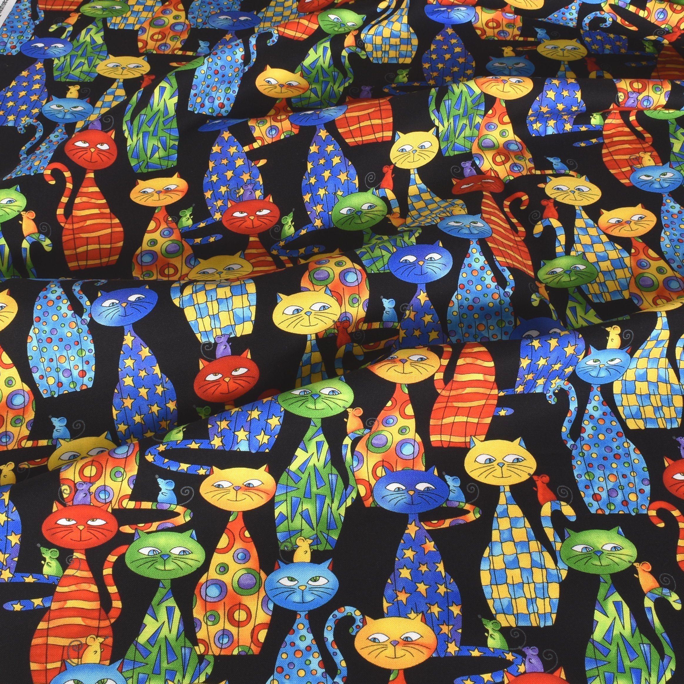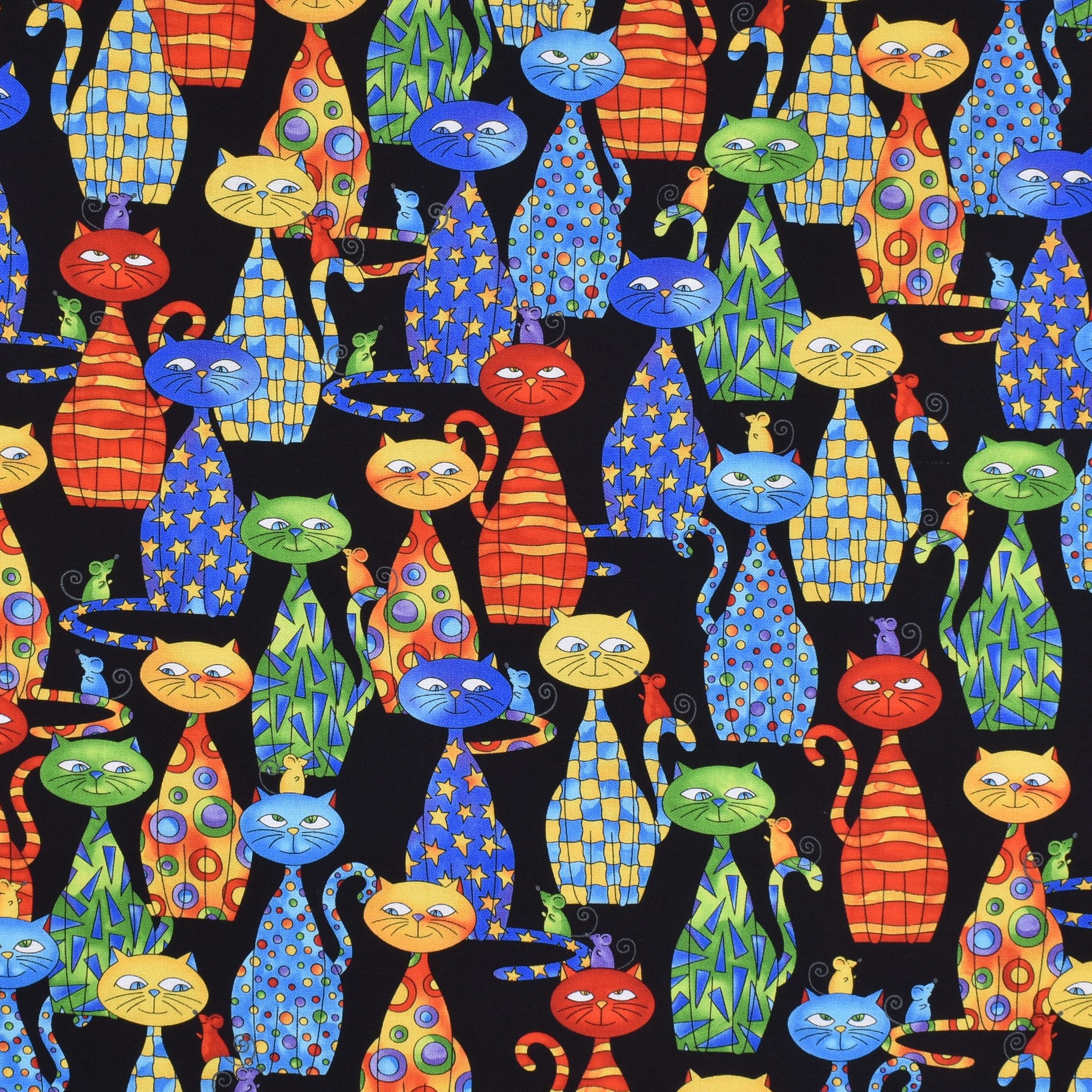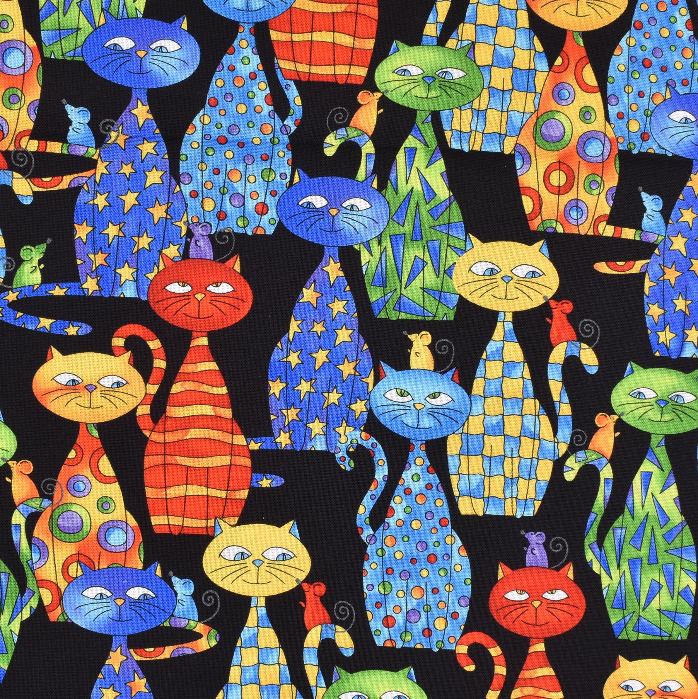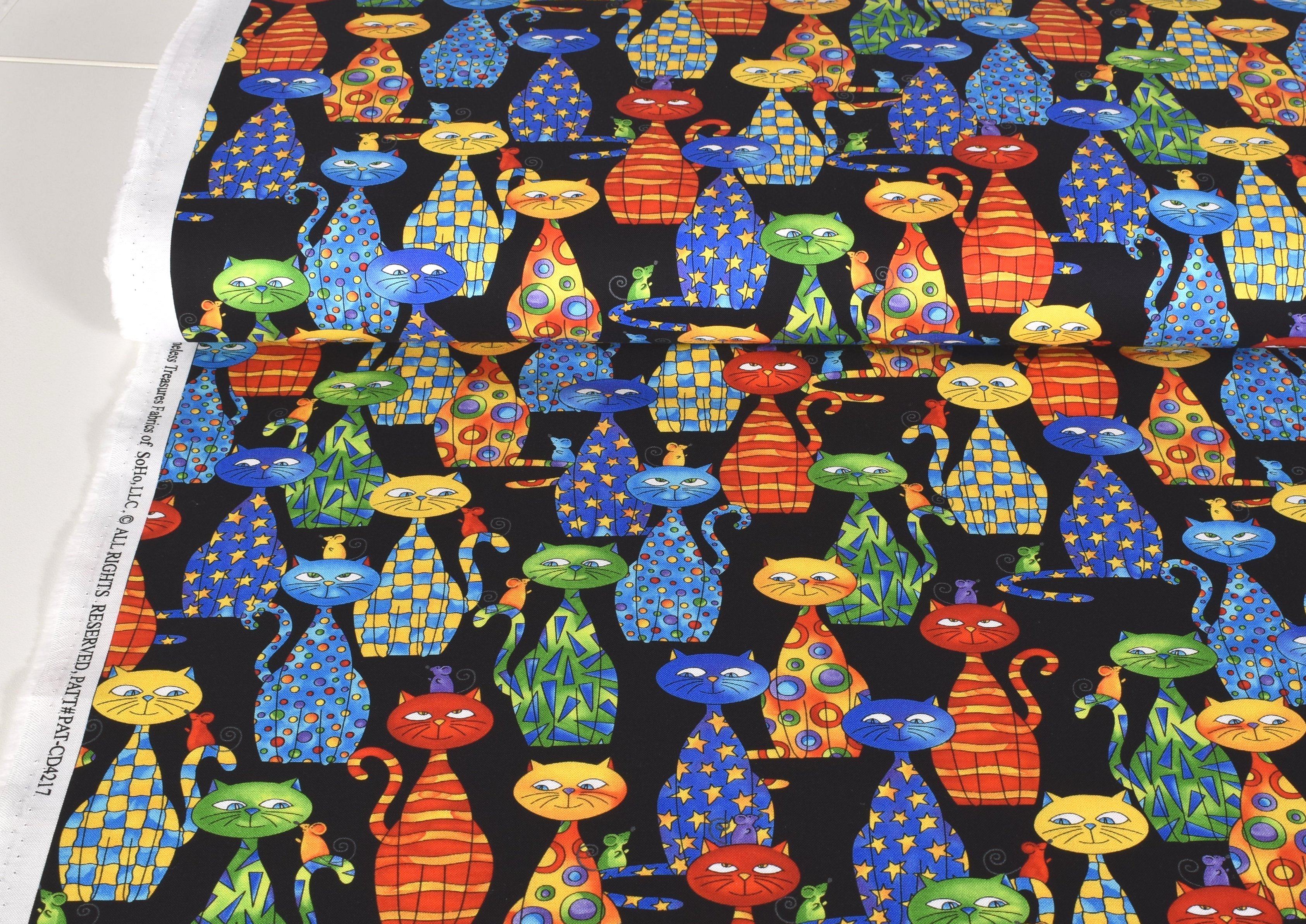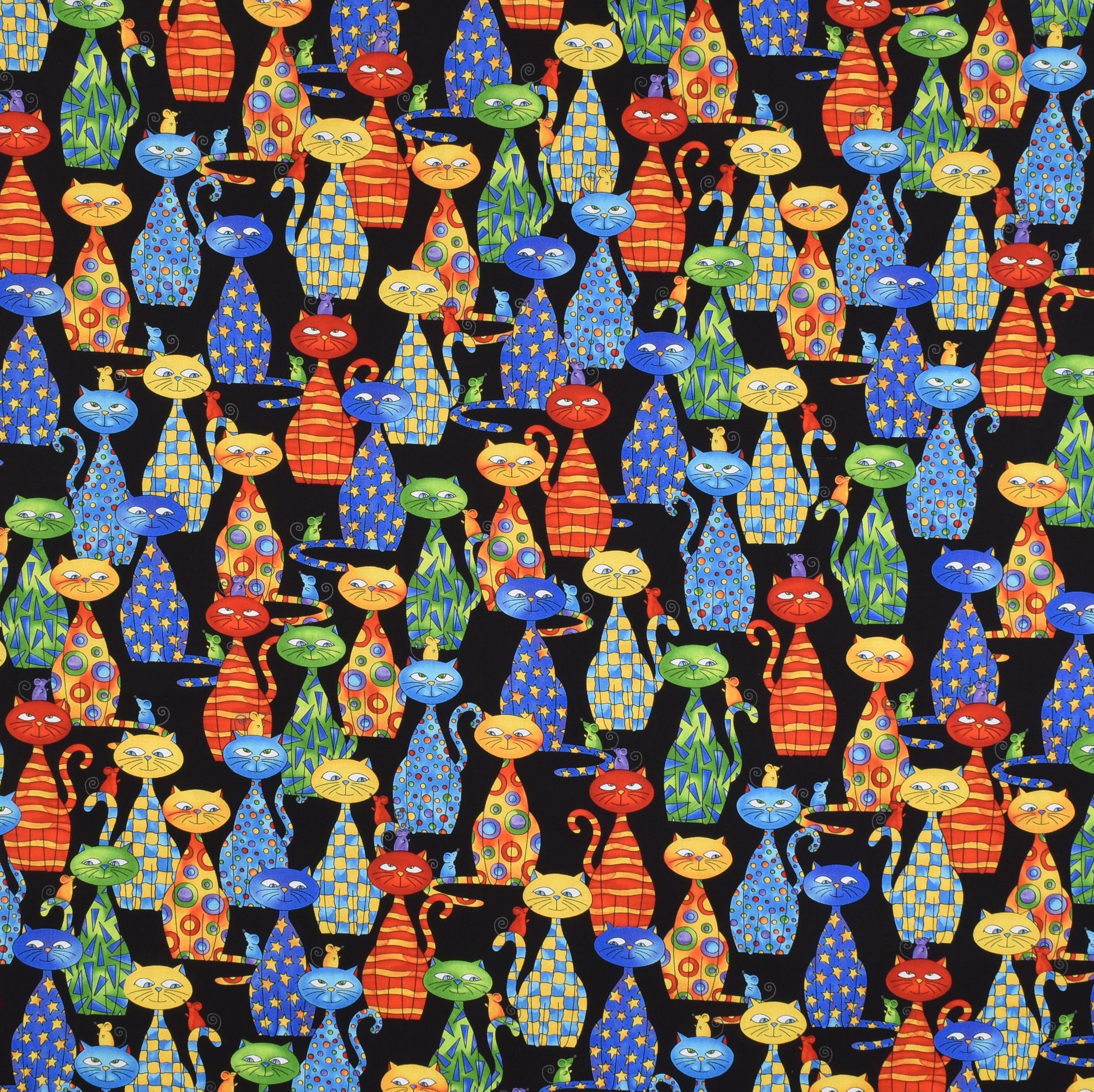 Wieder da!! Patchworkstoff mit bunten Katzen aus der Serie "Meouw you going?"