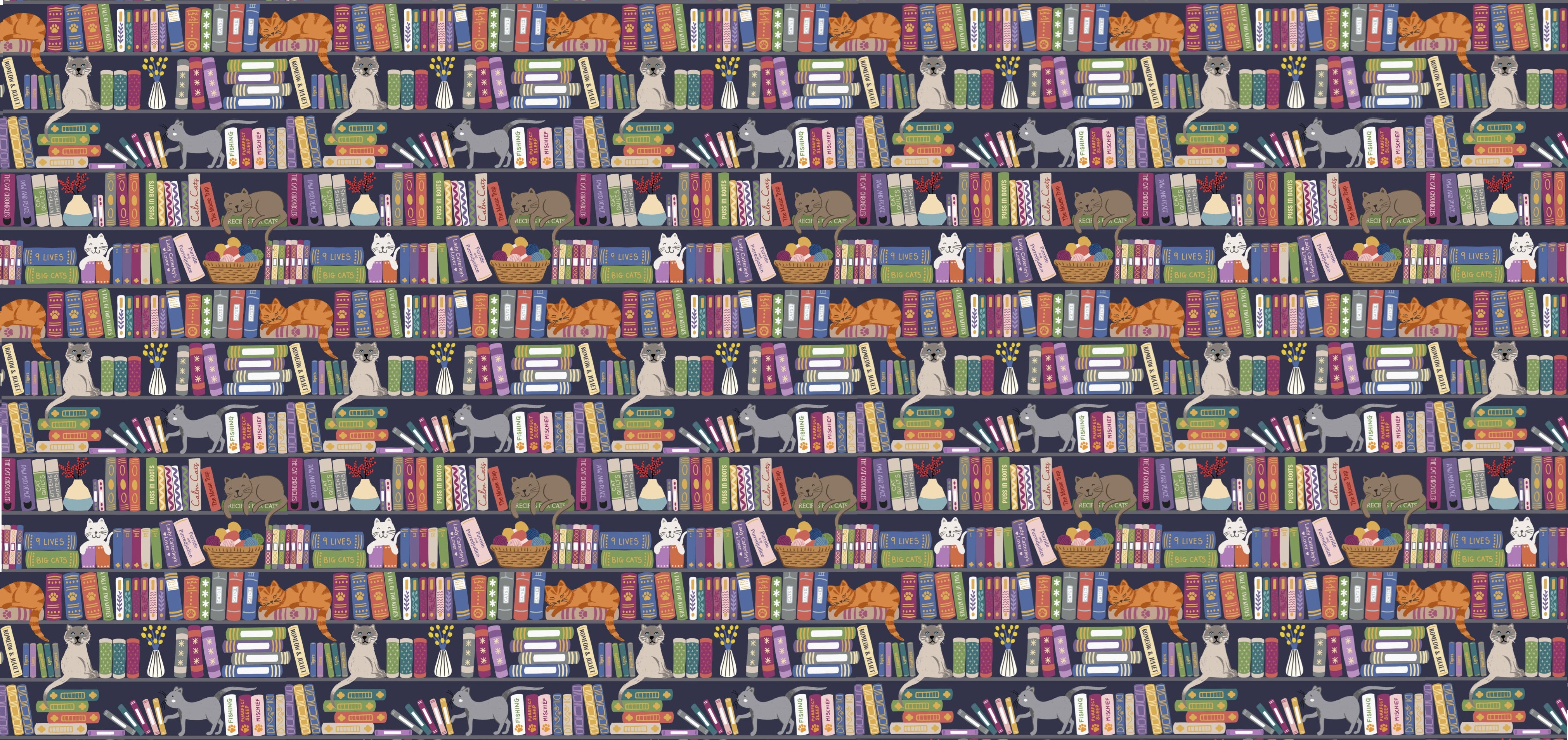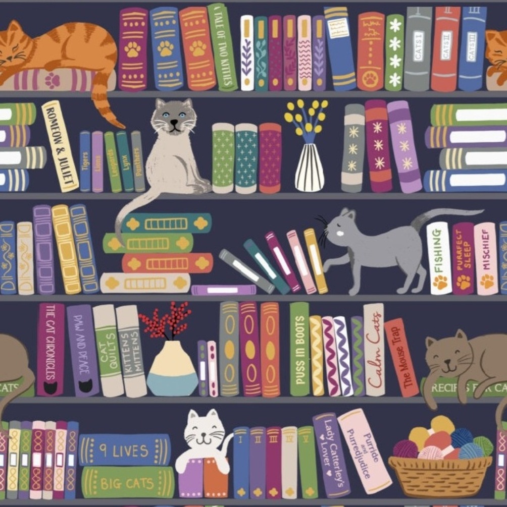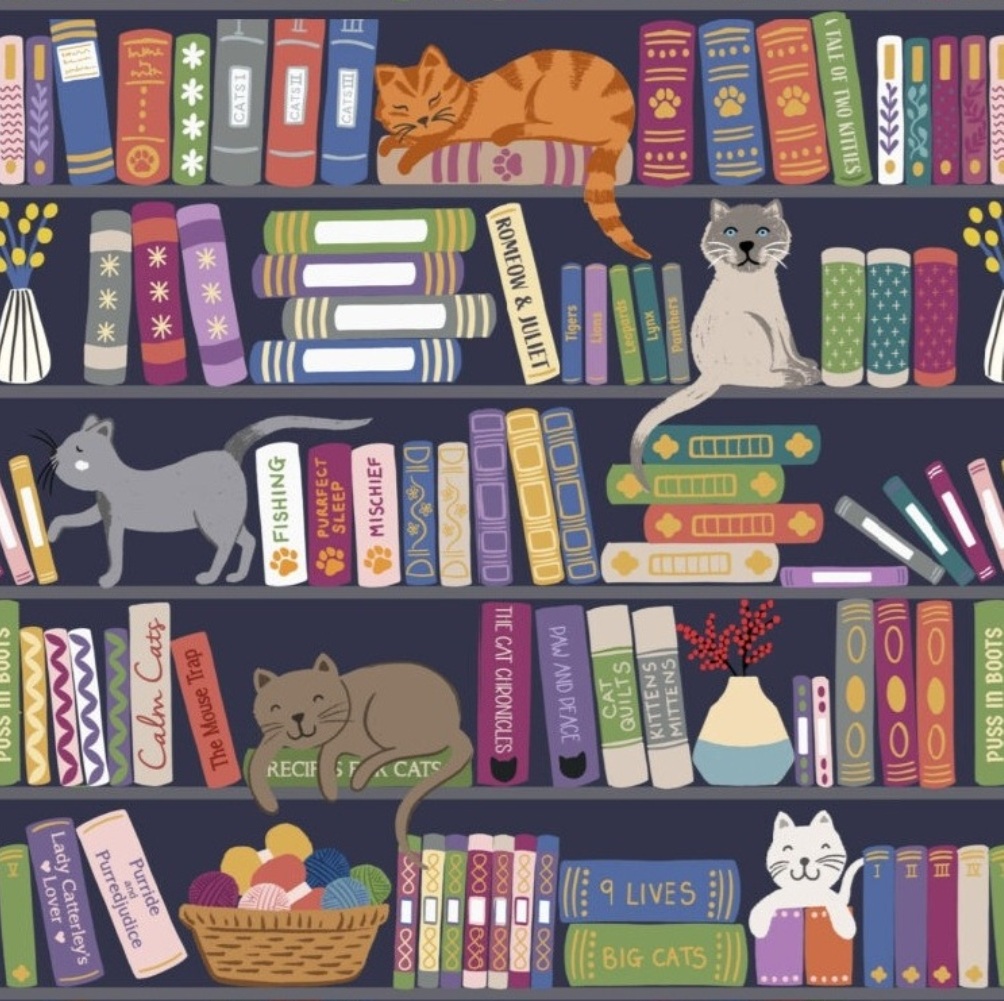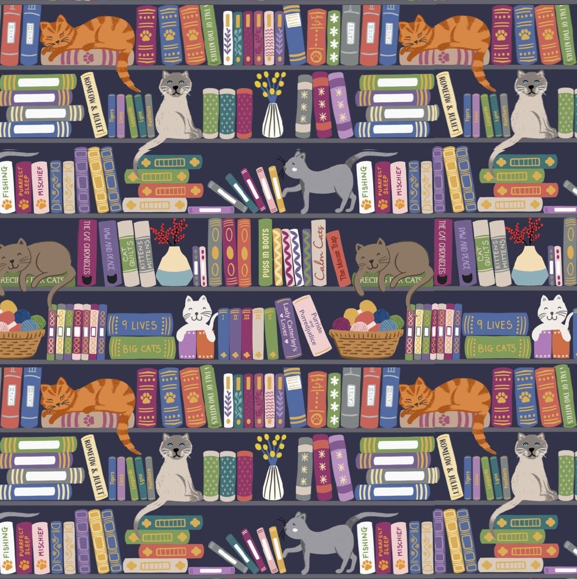 Patchworkstoff mit Büchern und Katzen aus der Serie "Purrfect Book Club"