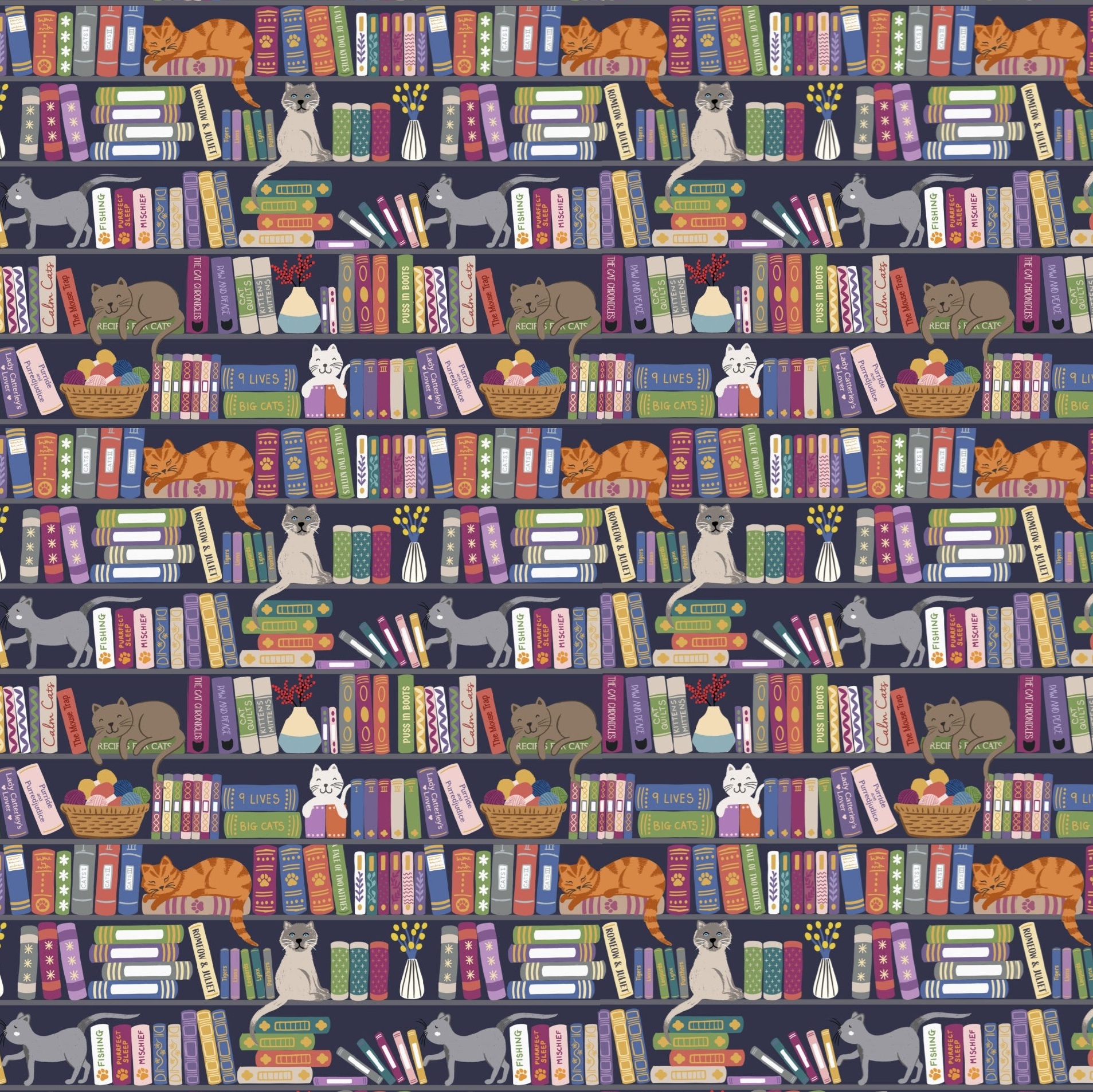 Ausgefallener Webware Baumwollstoff in Dunkelblau aus der Serie "Purrfect Book Club" von Lewis & Irene
