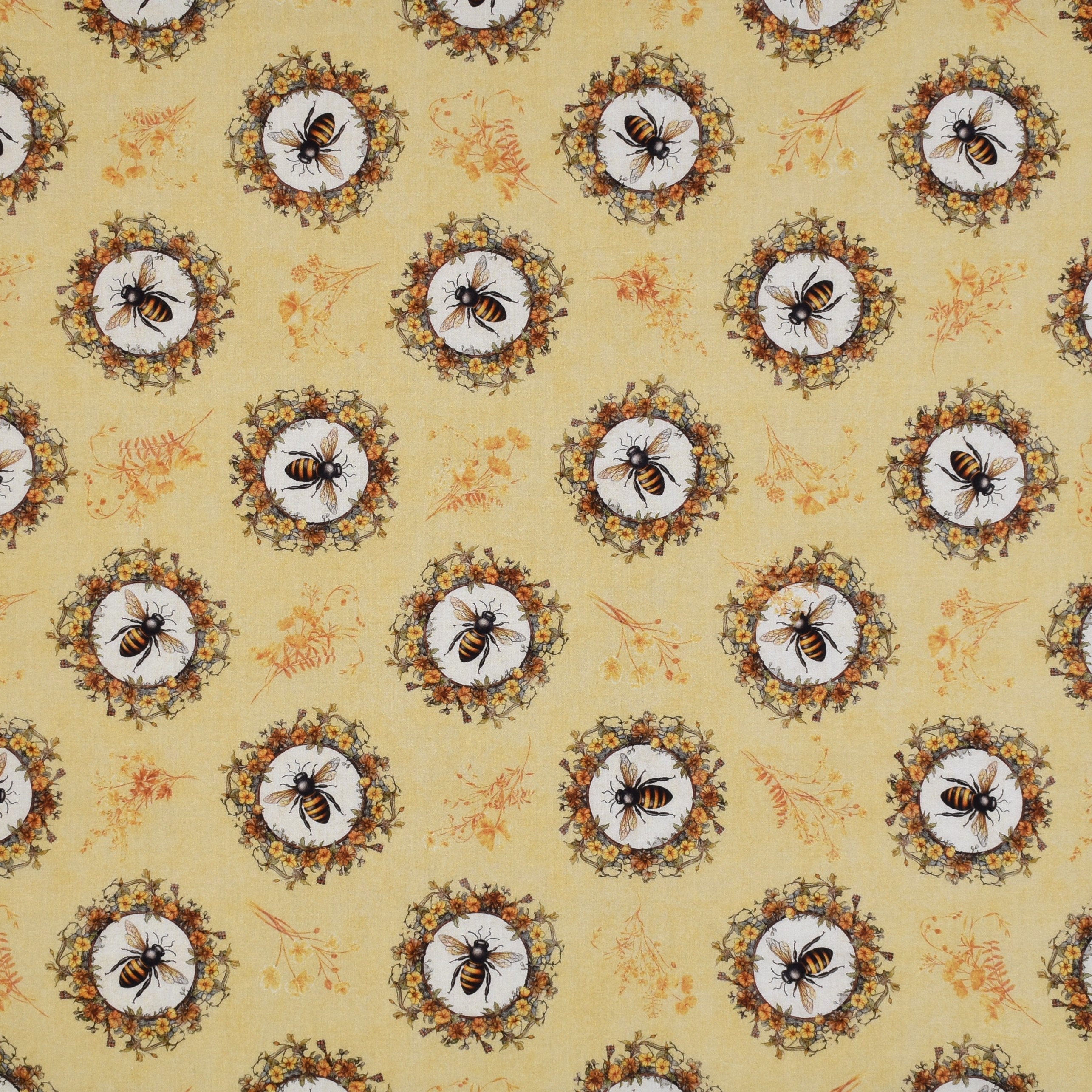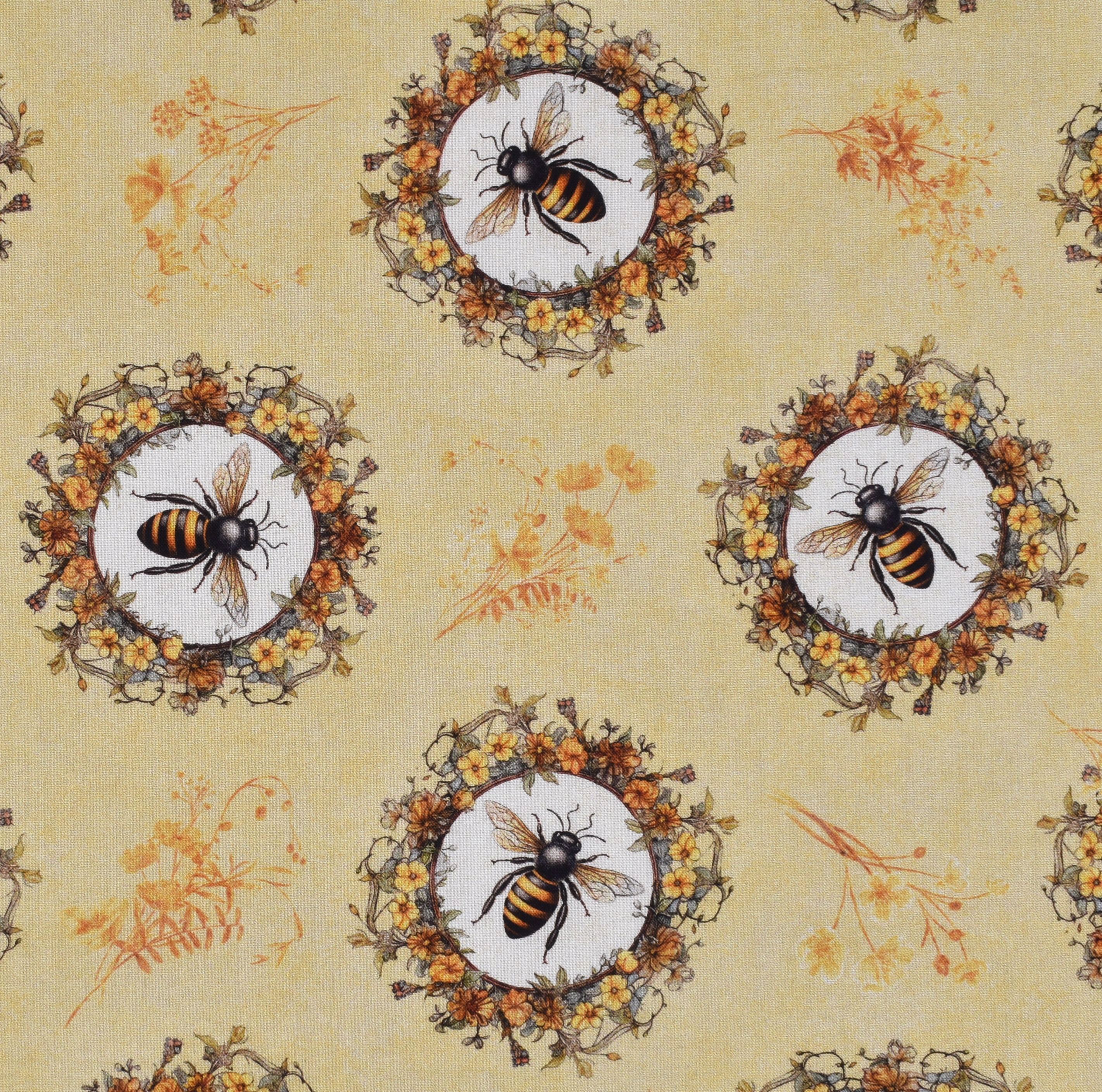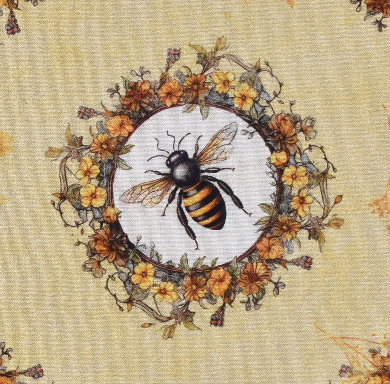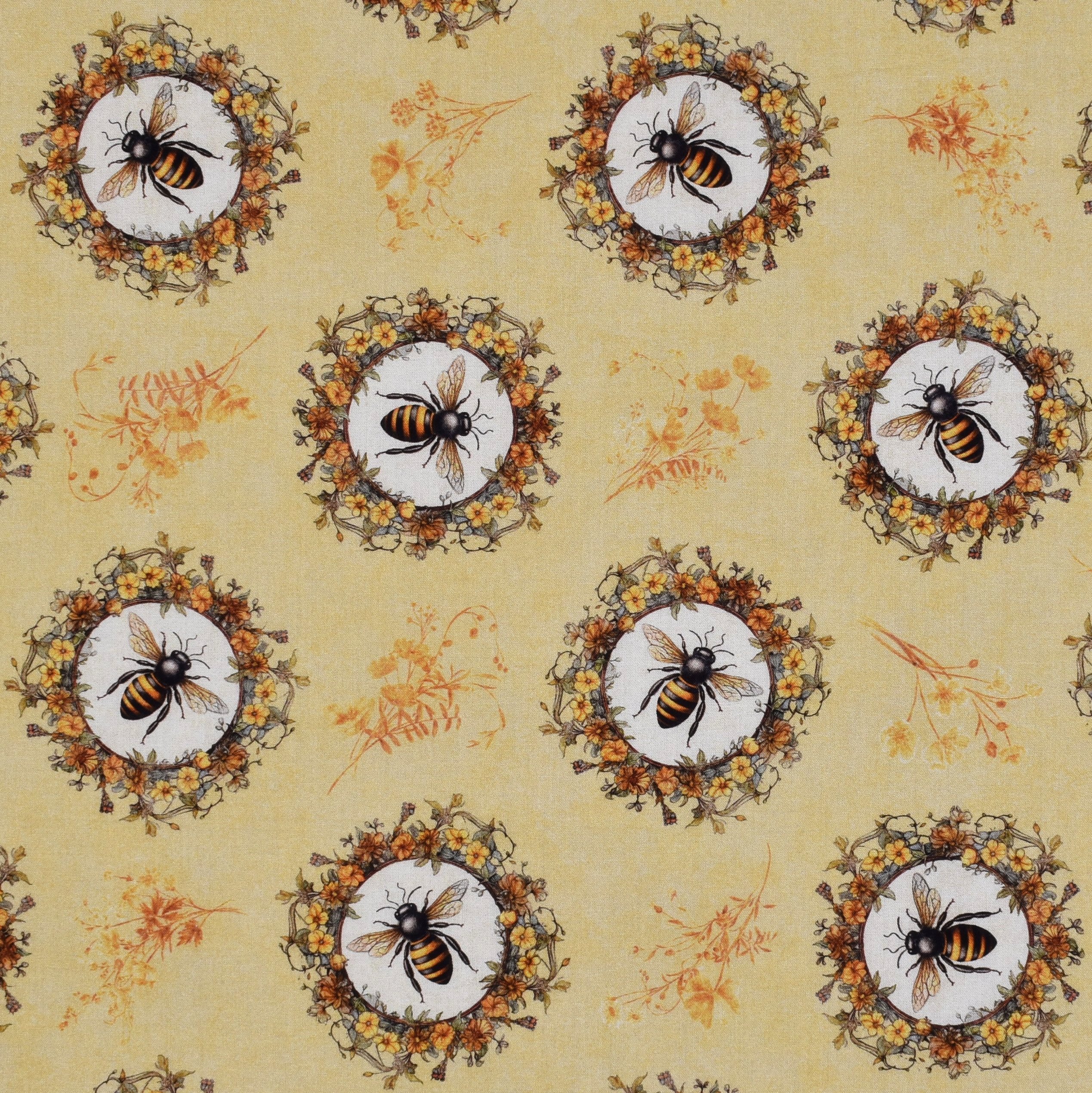 Großes Patchworkstoff mit nostalgischen, wunderschön gezeichneten kleinen Bienenbildern und Blumen auf Gelb aus der Serie "Queen Bee".